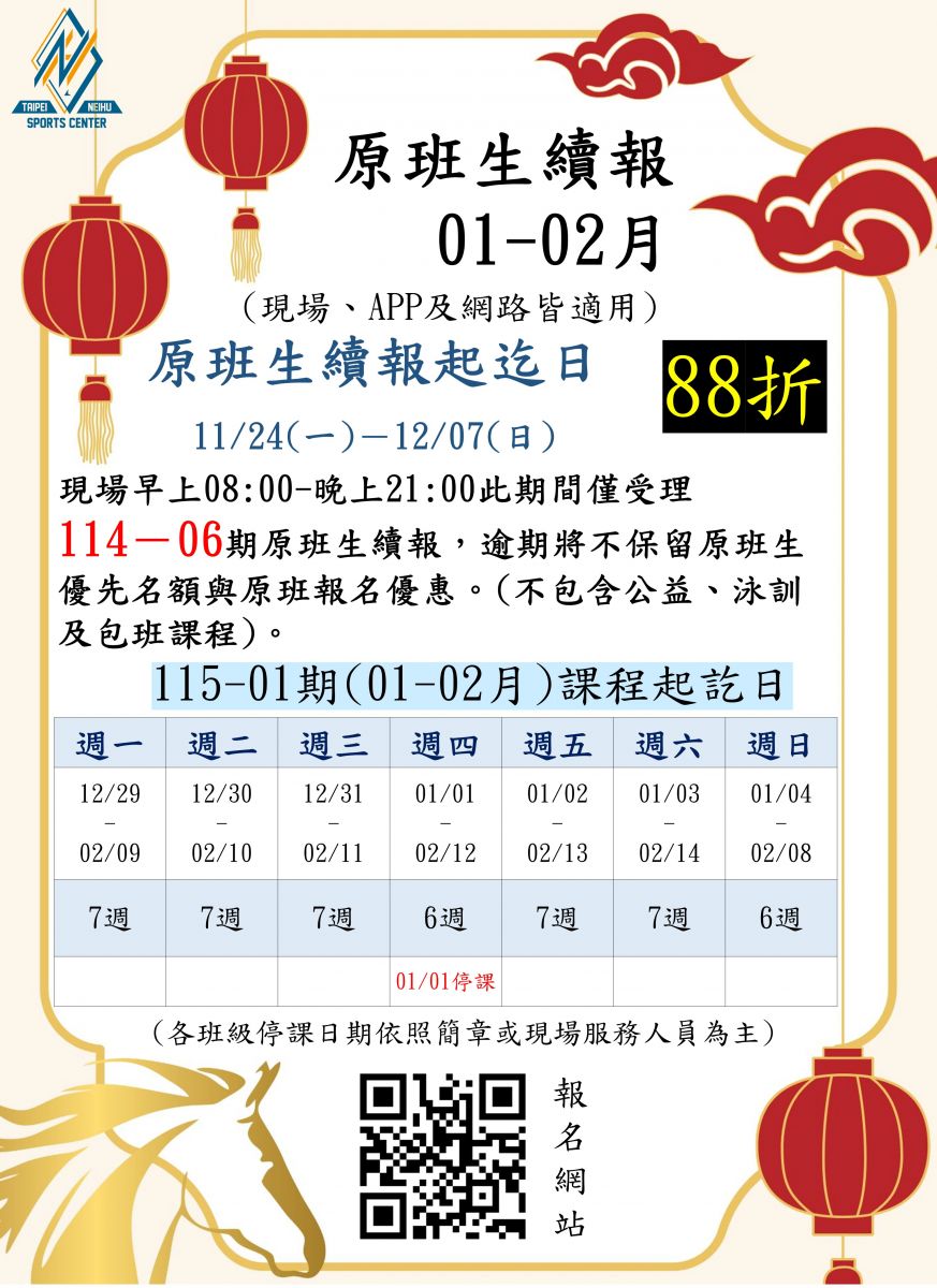 115-1期(01-02月)運動研習課程原班續報期程-上課起訖日